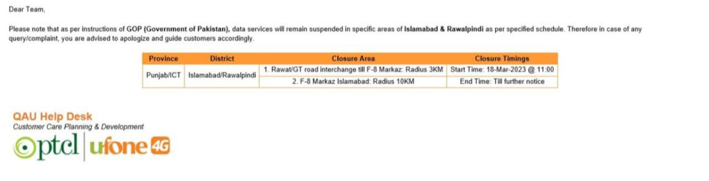 According to Ufone, internet services were taken down as per instructions from the GOP (Government of Pakistan) and will remain suspended in some areas of Islamabad and Rawalpindi until further notice.