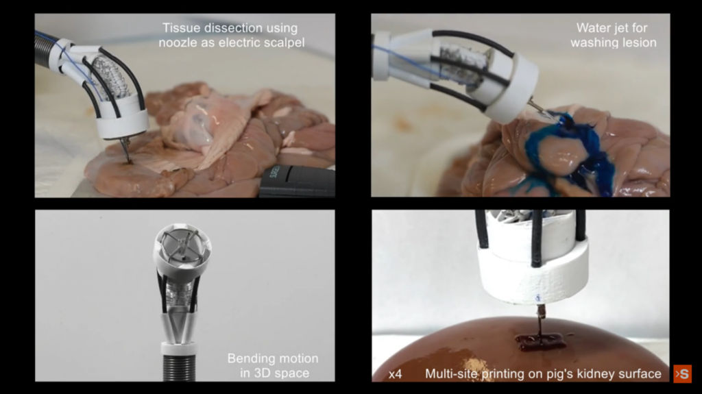 With its soft robotic arm, F3DB can effectively assemble biomaterials that contain living cells directly onto damaged organs or tissue. The bio printer’s snake-like, flexible body can be inserted into the body through either the mouth or anus and a pilot or surgeon can control its movements with hand gestures